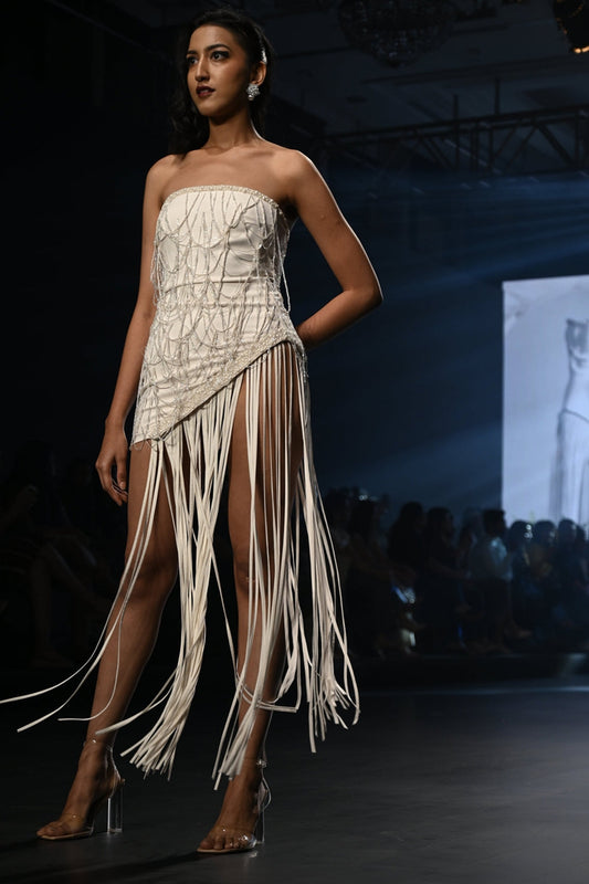 Ombre Draped Saree Dress with a Bralette and Pearl Detailing on Mesh Throw