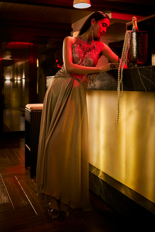 Taupe Crushed Shimmer Fabric Jumpsuit Gown