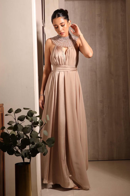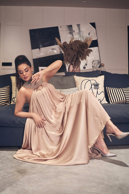 Barkha Singh in Taupe Maxi Dress with Embellished Choker