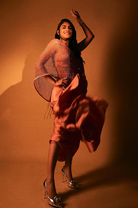 Mrunal Thakur in Nectarine Draped Cut-out Dress with Pearl Detailing on Mesh