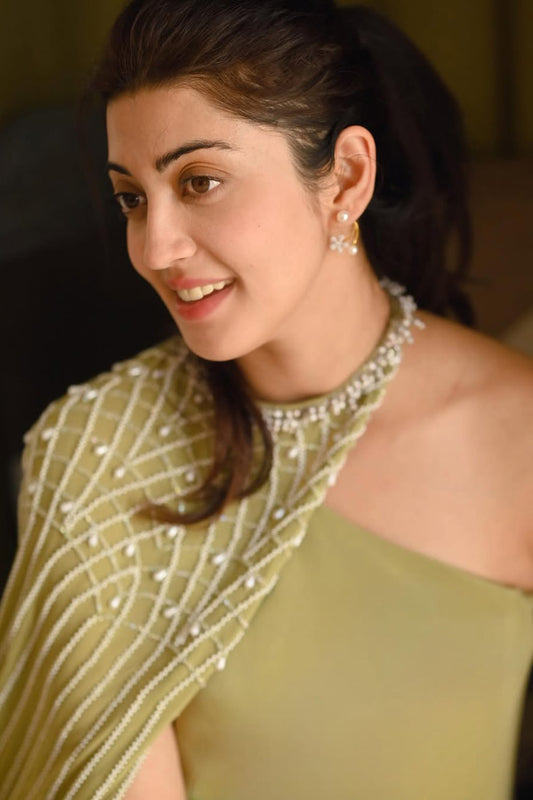Pranita Subhash in Sage Green Gathered Skirt with One Shoulder Top and Cape