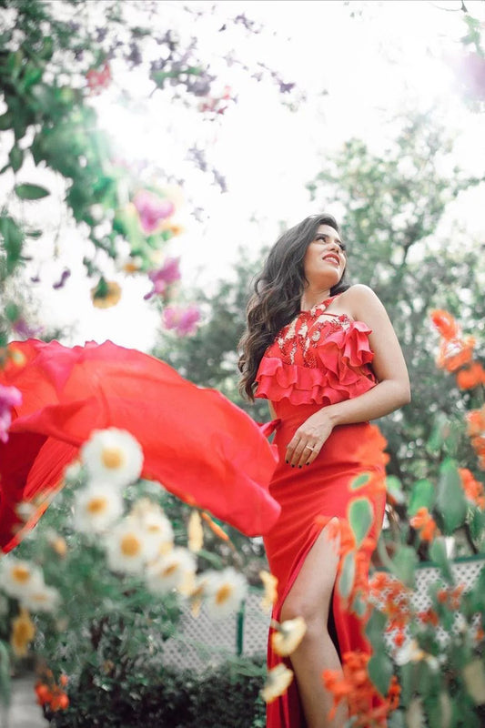 Rhea Singha in One Shoulder Scarlet Red High-Slit Ruffle Detailed Gown