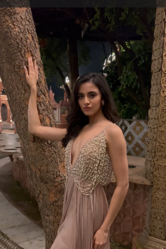 Rhea Singha in Taupe jumpsuit embellished with pearl strings and tasseled cords