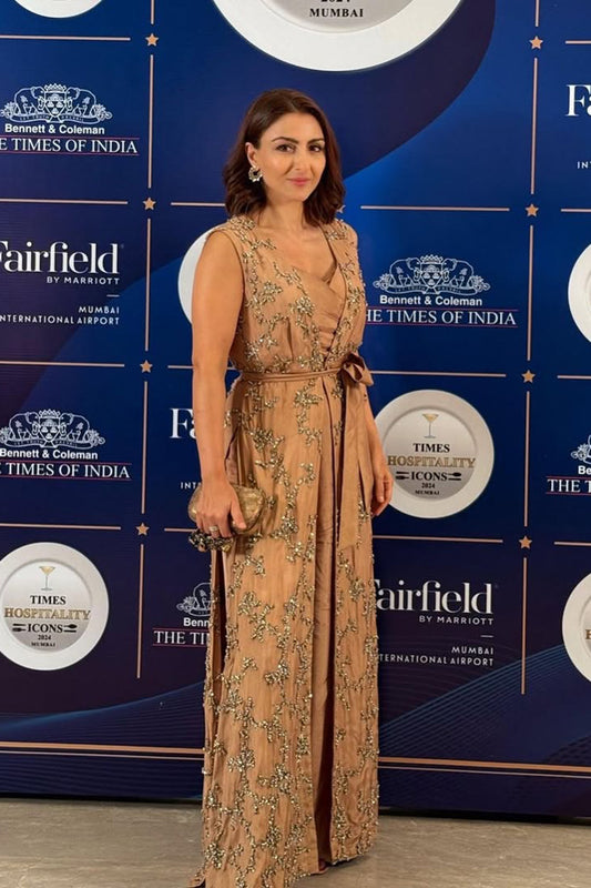 Soha Ali Khan in Golden oscar pearls, sequins and crystal embroidered jacket teamed with a bralette and pants