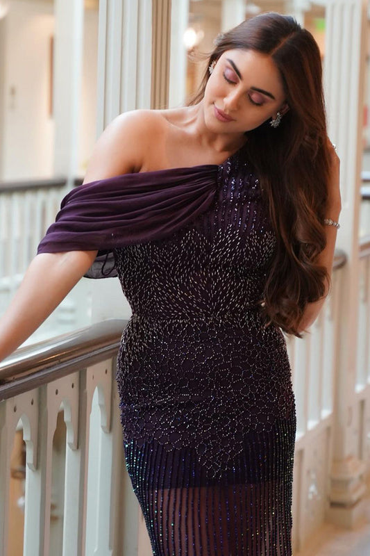 Malini Agarwal in Wine One Shoulder Gown