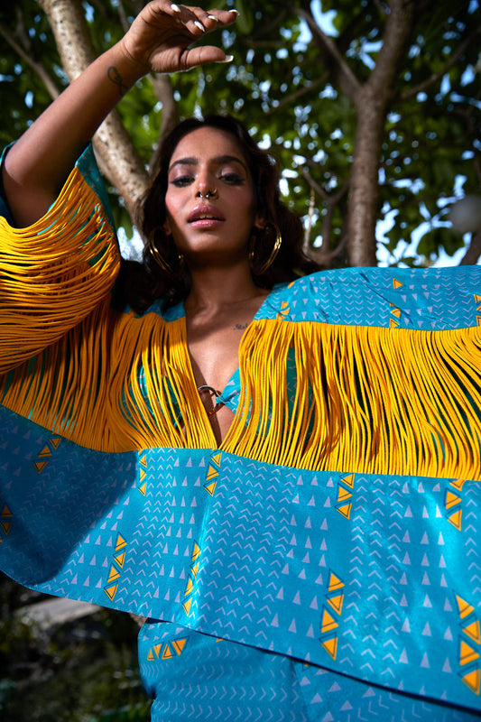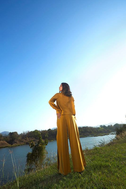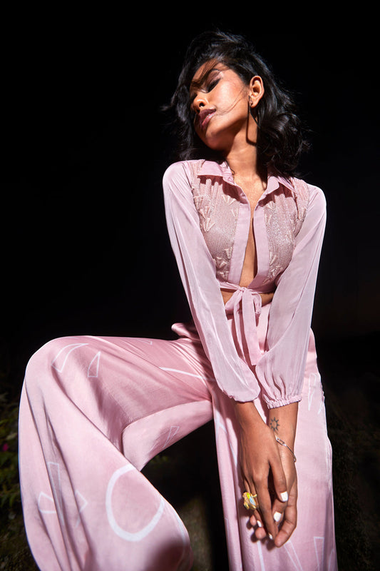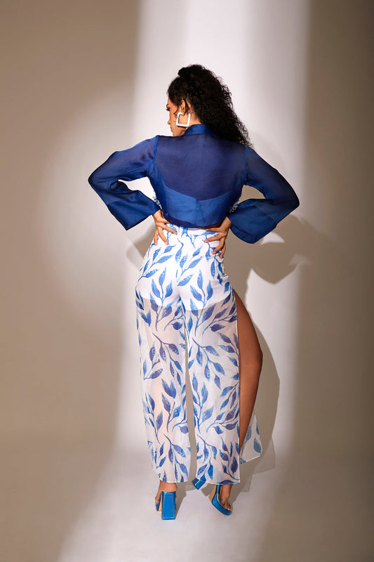 Celestial Blue Overlap Pleated Trousers with Jacket And Bralette