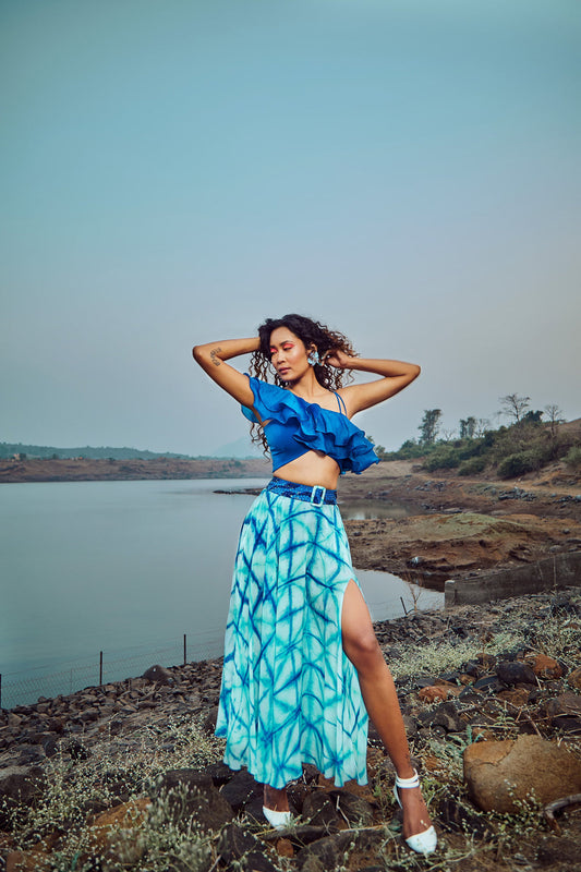 Azure Blue Ruffled Organza Blouse With Skirt And Belt