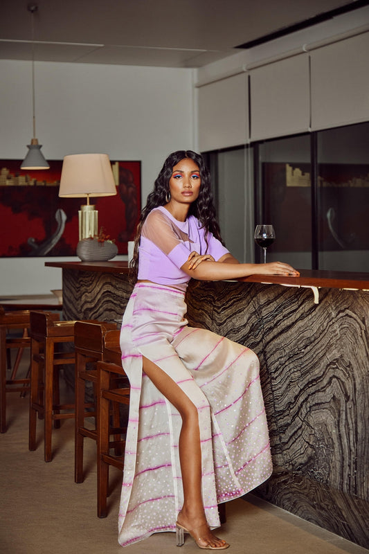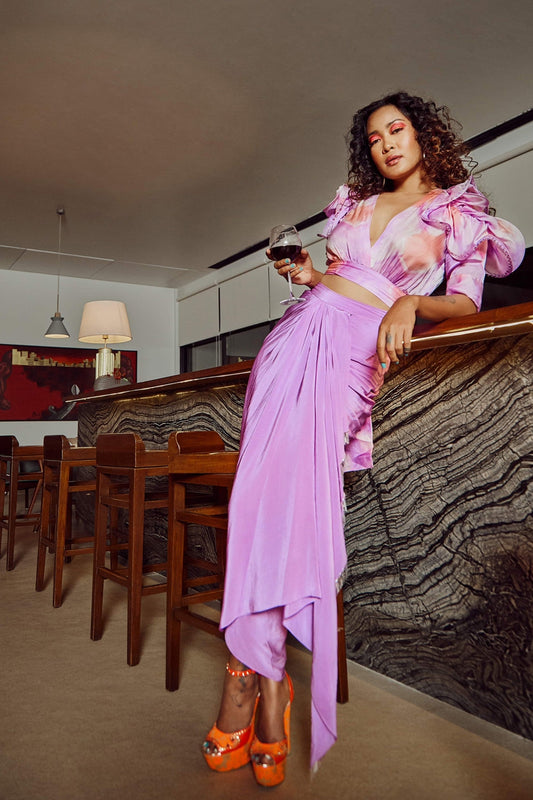 Lavender Hand Textured Silk Chiffon Overlap Top With Skirt