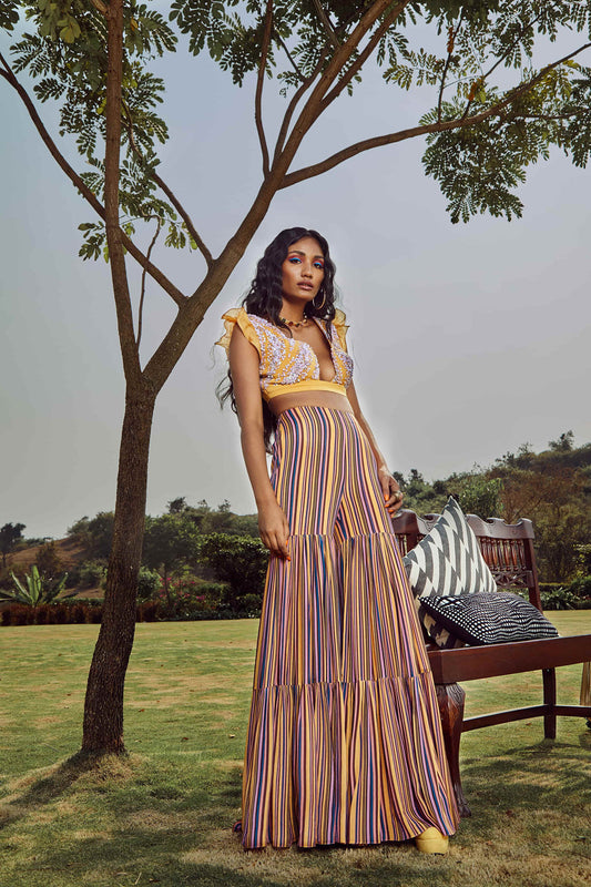 Yellow Italian Crepe Embroidered Amber Bandeau Top With Pants