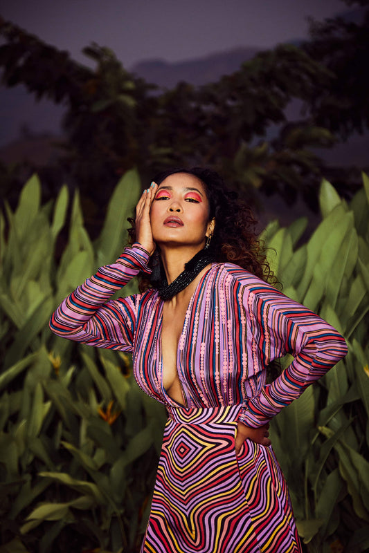 Espresso Drape Dress With An Asymmetric Swan Inspired Embroidered Bodice
