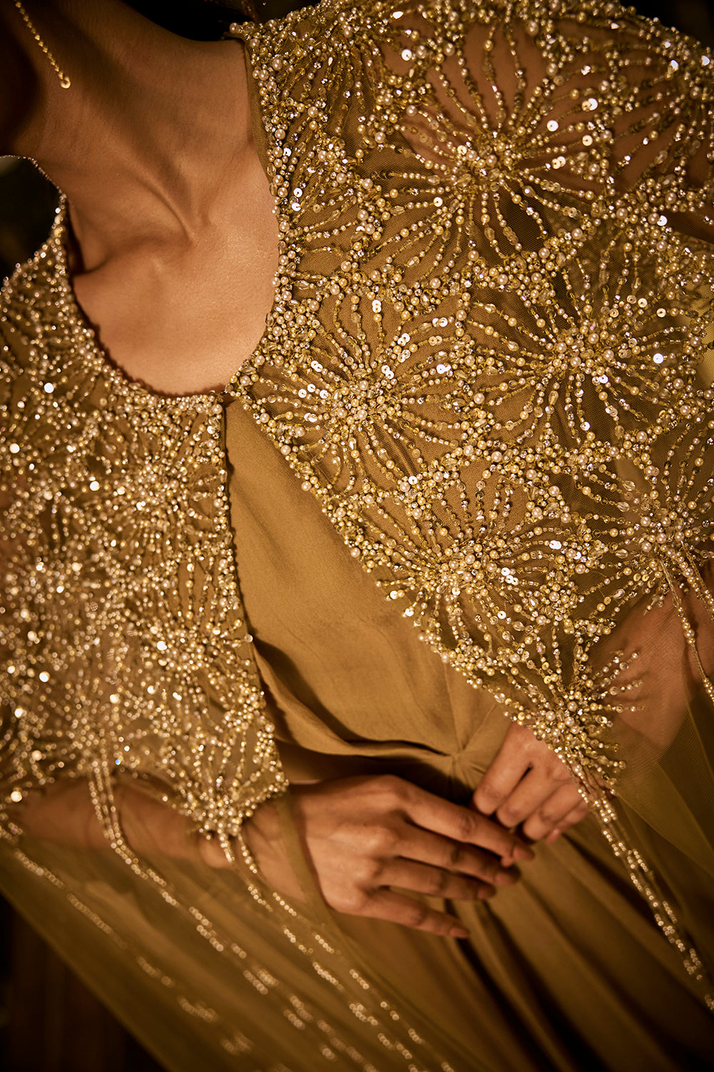 This olive green ensemble features a fluid georgette dress layered with a statement tulle cape. The cape is intricately hand-embroidered with shimmering pearls, sequins, and cutdana.The gown’s soft drape and flow enhance its regal elegance, while the sheer embroidered cape adds a modern touch of drama.