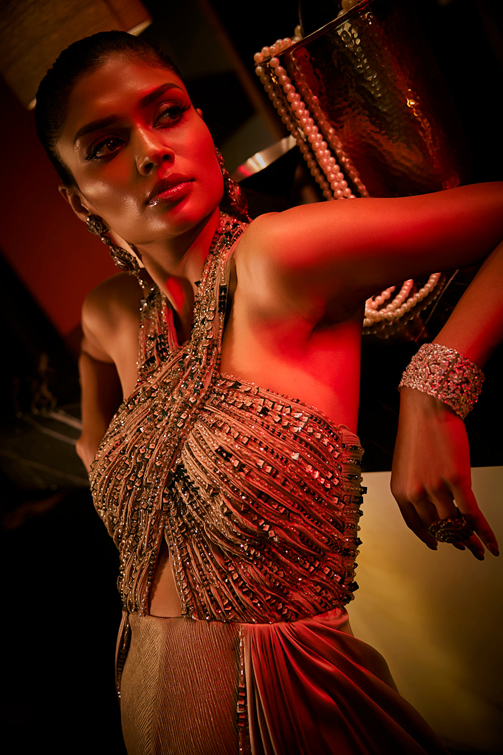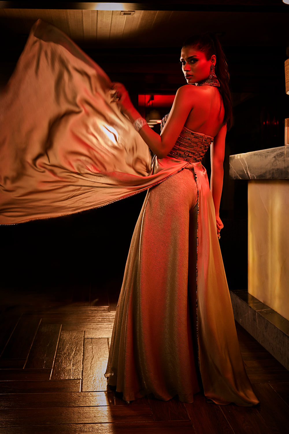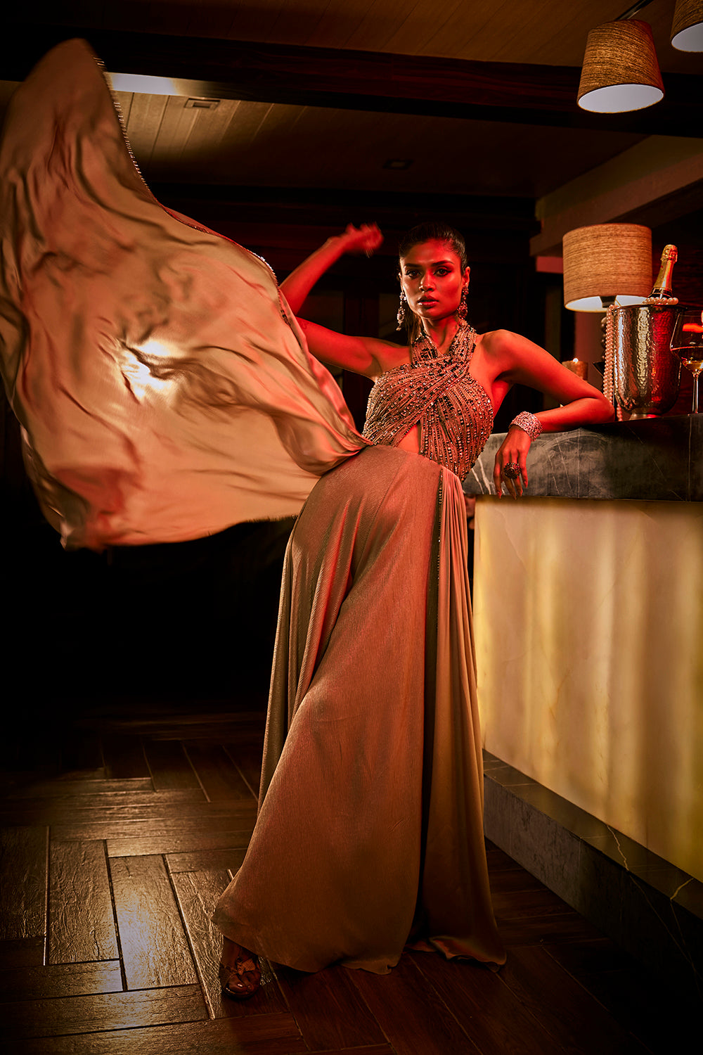 This taupe jumpsuit with a satin overlayer exudes contemporary allure with its sculpted halter neckline. Crafted in crushed fabric and enhanced with a fluid satin overlay and beaded bodice, it strikes the perfect balance between structure and movement.