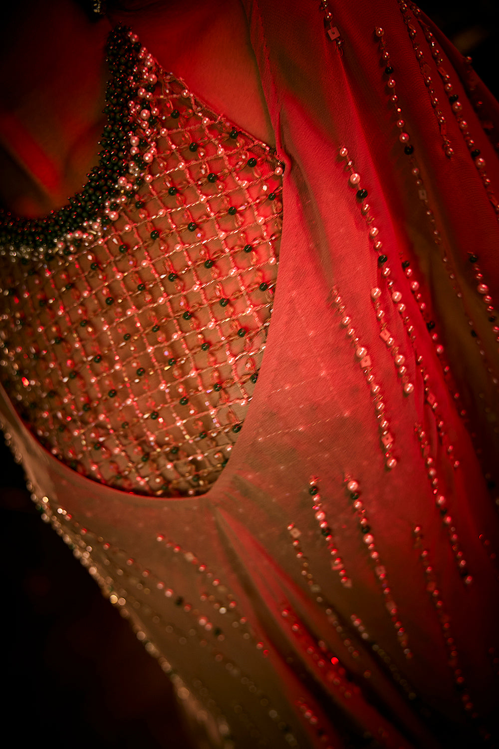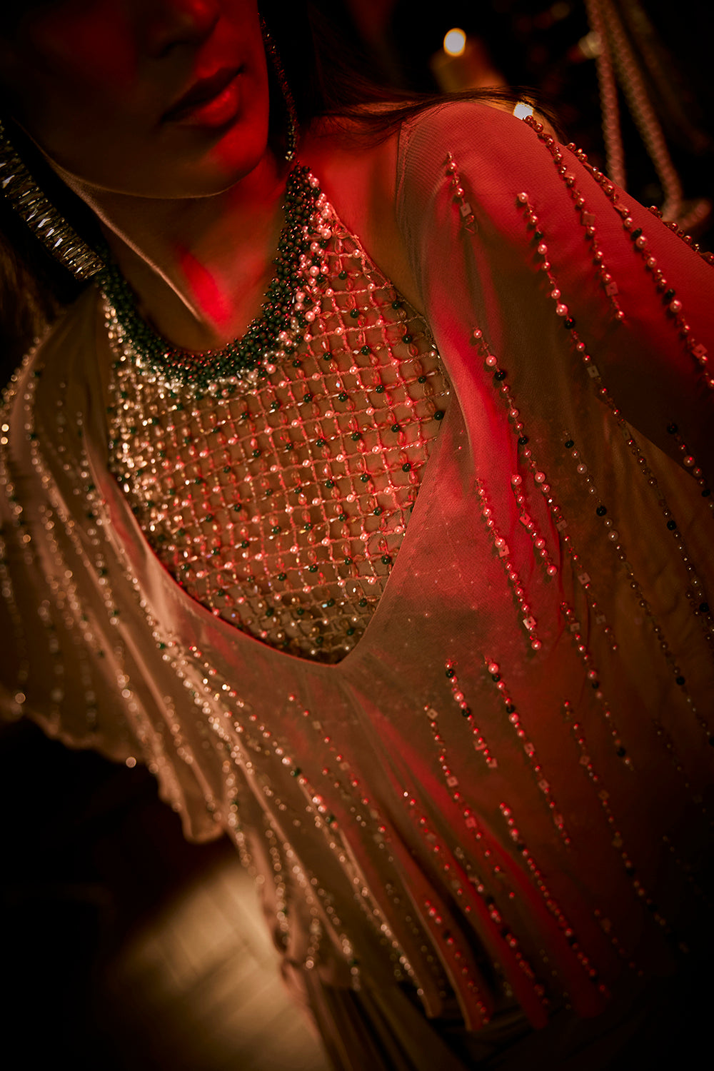 This elegant ensemble features a draped silk satin skirt paired with a sheer tulle cape and intricately hand-embroidered cutwork blouse. The cape is delicately adorned with beads,pearls and sequins, adding shimmer and movement to the look. The combination of luxe satin and ethereal tulle creates a perfect balance of modern glamour and timeless sophistication